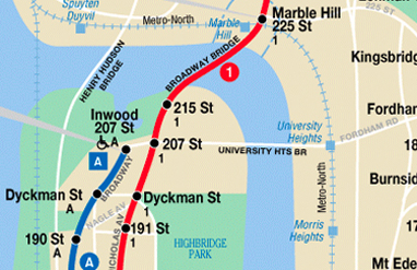 FDR North to Dyckman St exit. Stay right on 10th Ave, make left on 204st, then right on Broadway to 207st.