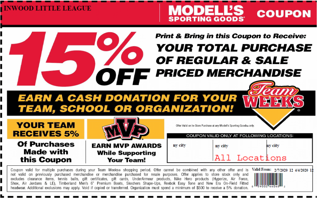 AnnouncementModell’s Coupon for FALLFebruary 26, 2020by InwoodLLBGet 15% off at Modell’s and the league gets back 5% as well. The coupon is good until April 4th, 2020.